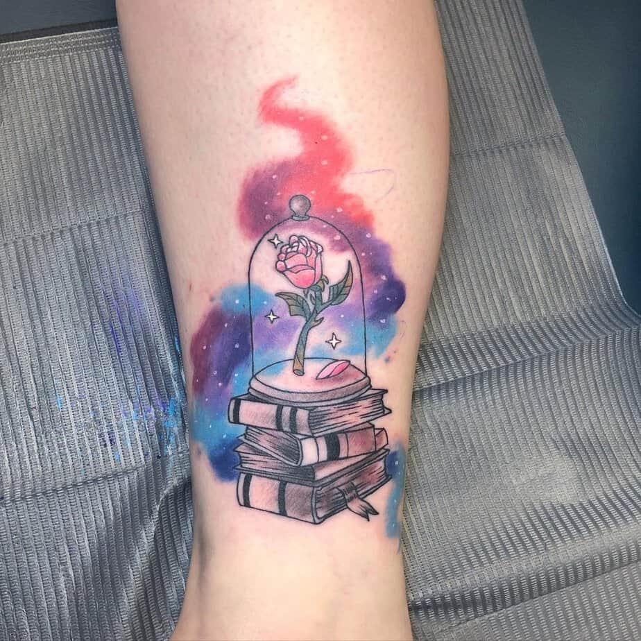 Okay, picture this: a forearm tattoo with the rose safely tucked under its dome, petals drifting down like whispered seconds. It’s a quiet reminder of the Beast’s deadline to find love, but it also doubles as a redemption symbol — like, your choices matter and they can actually change you. I love tattoos that carry both story and a little moral nudge.