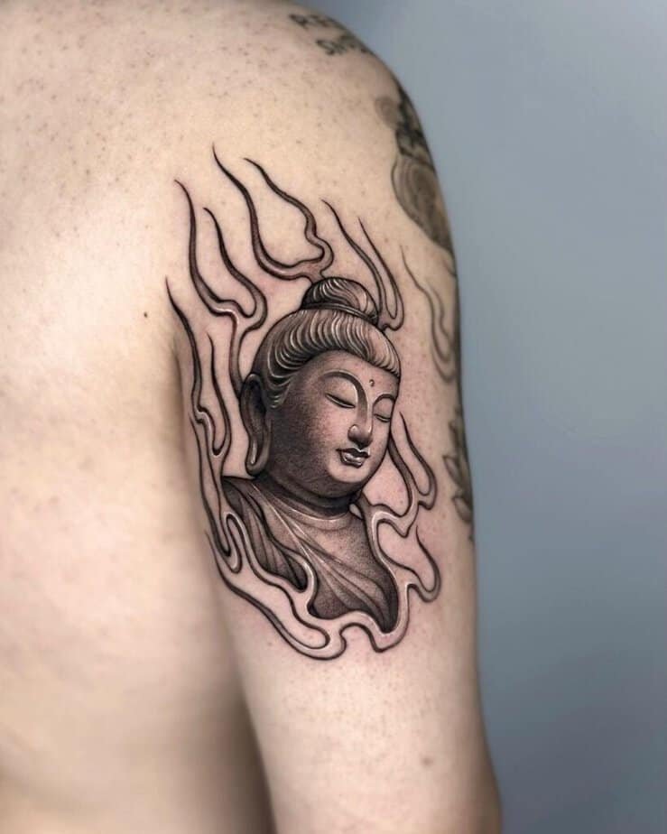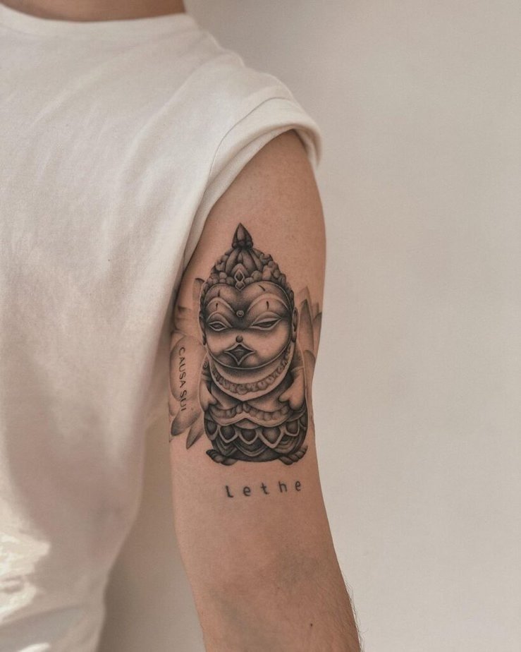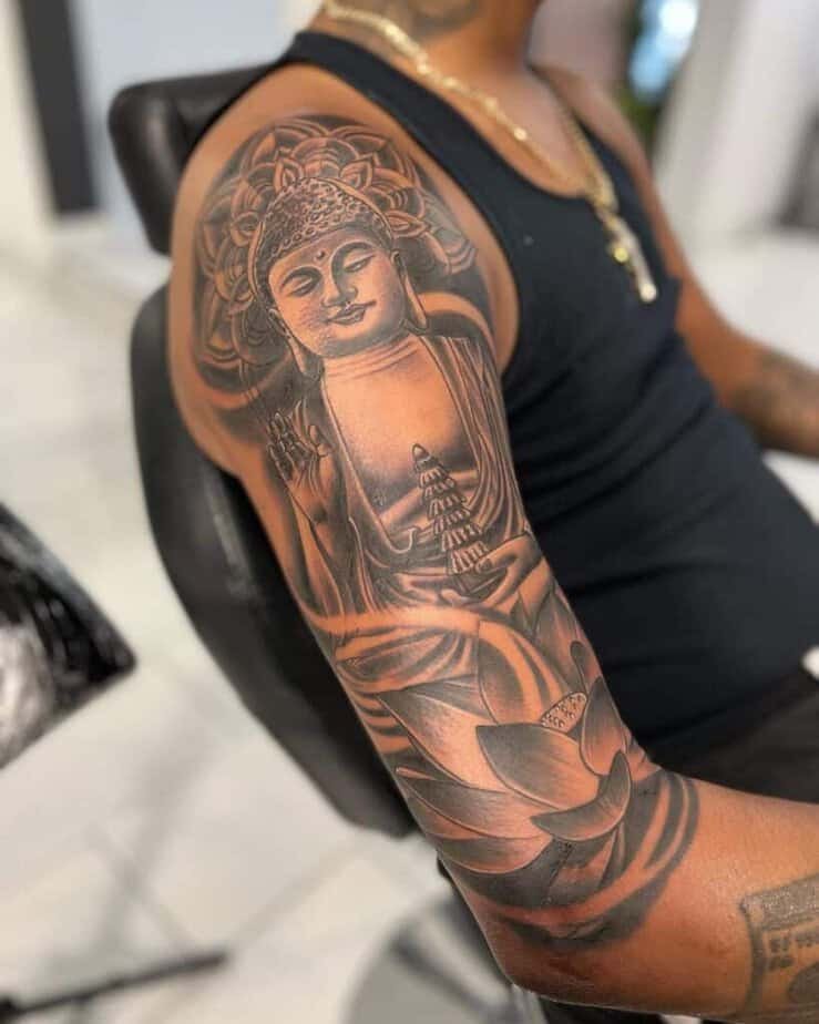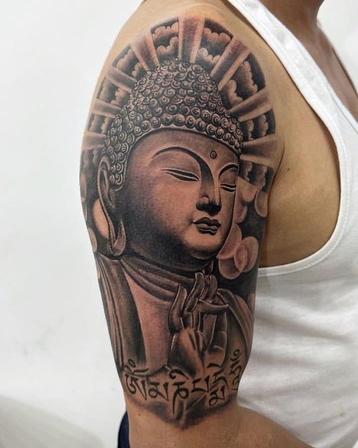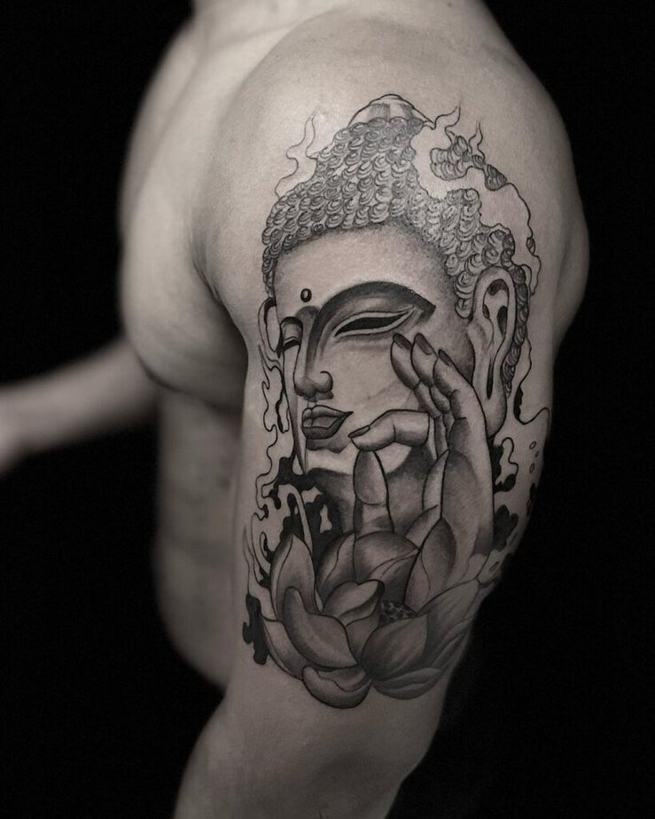 2. A timeless black-and-gray Buddha on the upper arm