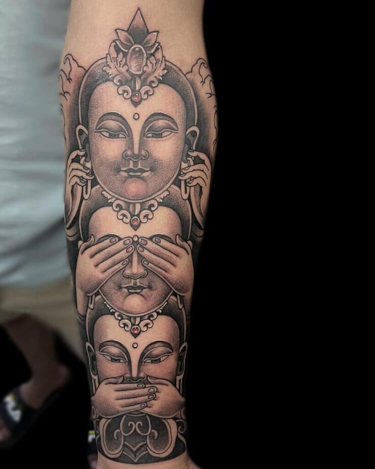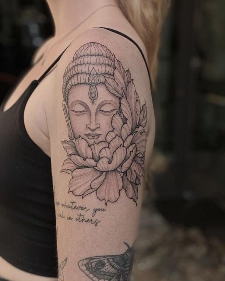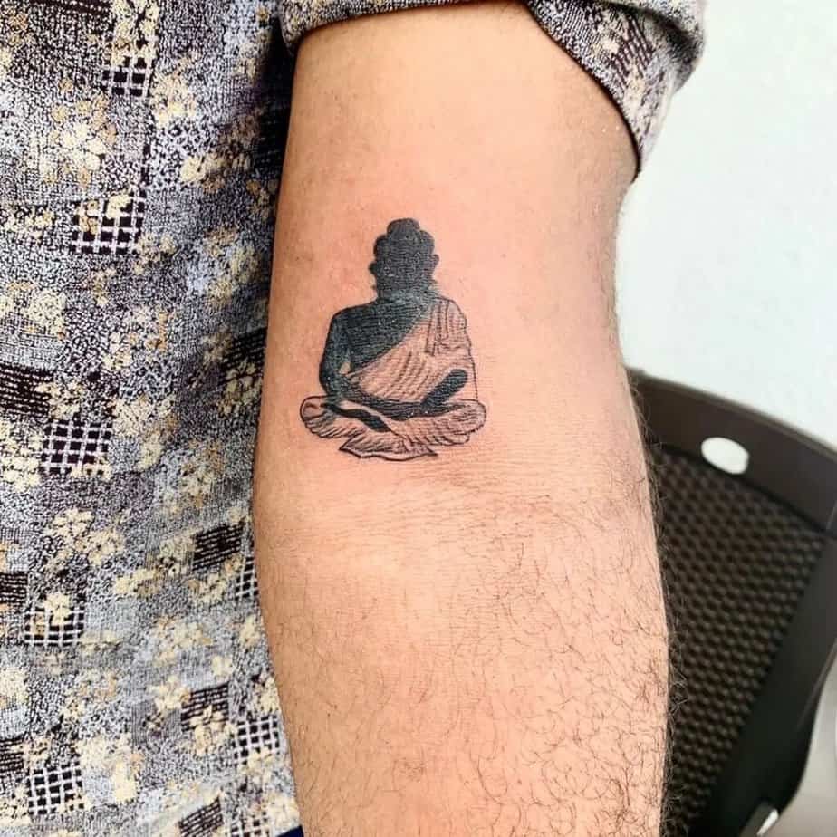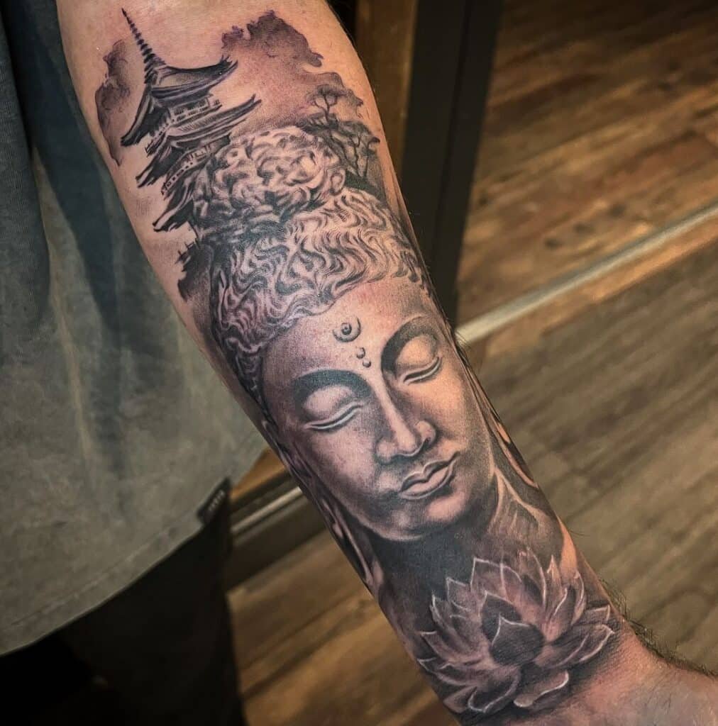 2. A timeless black-and-gray Buddha on the upper arm