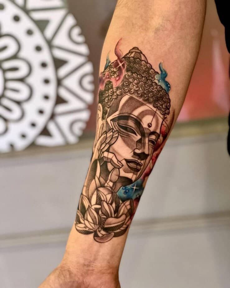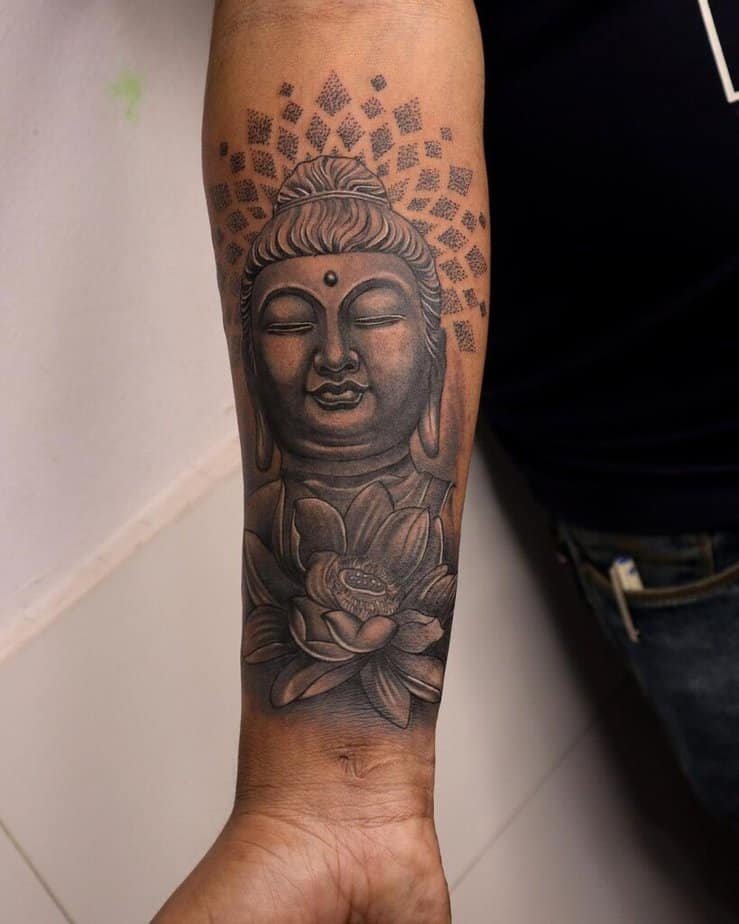 4. Buddha plus lotus on the forearm — quietly meaningful