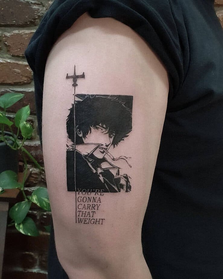This monochrome upper-arm piece nails Spike’s weary cool: cigarette, distant stare, and the Swordfish II ghosting above him. The line “You’re gonna carry that weight” underlines the whole thing — you get the melancholy, the baggage, and the stubborn move-forward energy all in one calm, reflective image.