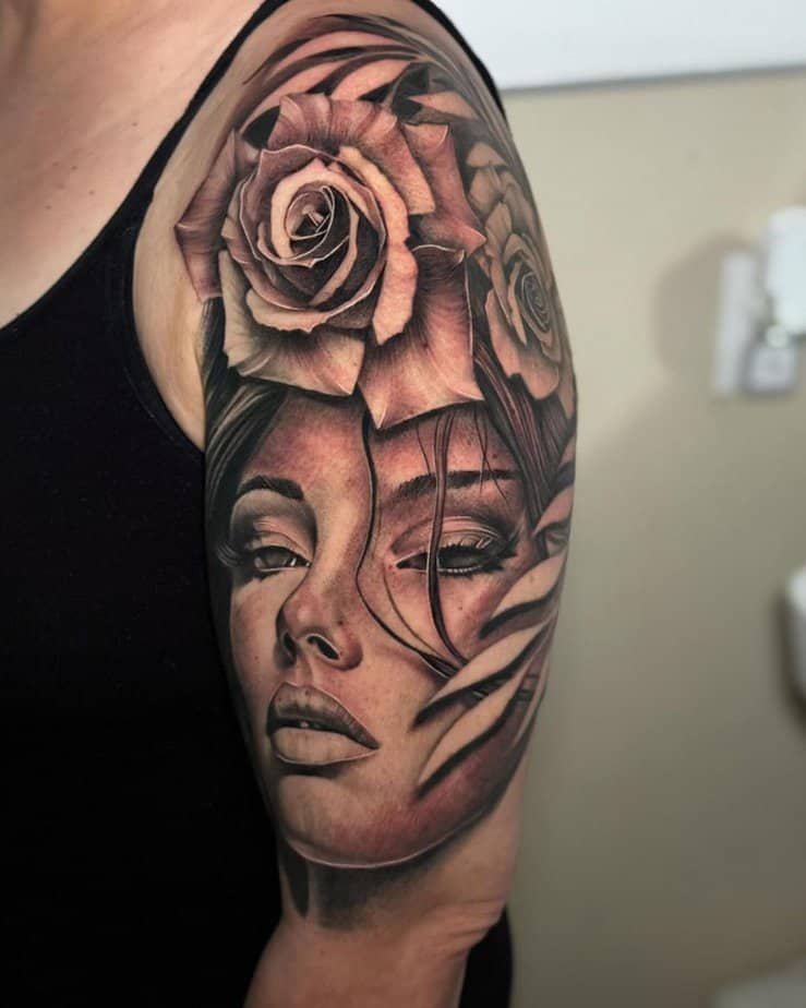 A portrait tattoo layered with roses feels like a painting you can touch. The soft shading brings the face to life, and the roses add passion and tenderness. It’s a beautiful mix of strength and vulnerability — perfect if you want something emotionally rich and artistically detailed.