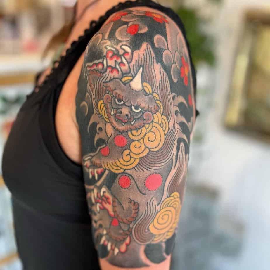 Pulling from Japanese tradition, a shisa guardian is colorful and fierce. The swirling clouds, reds, and golds make it pop — and it carries that protective energy like an ancient talisman. If you want color and myth in one go, this is a dramatic, joyful choice.