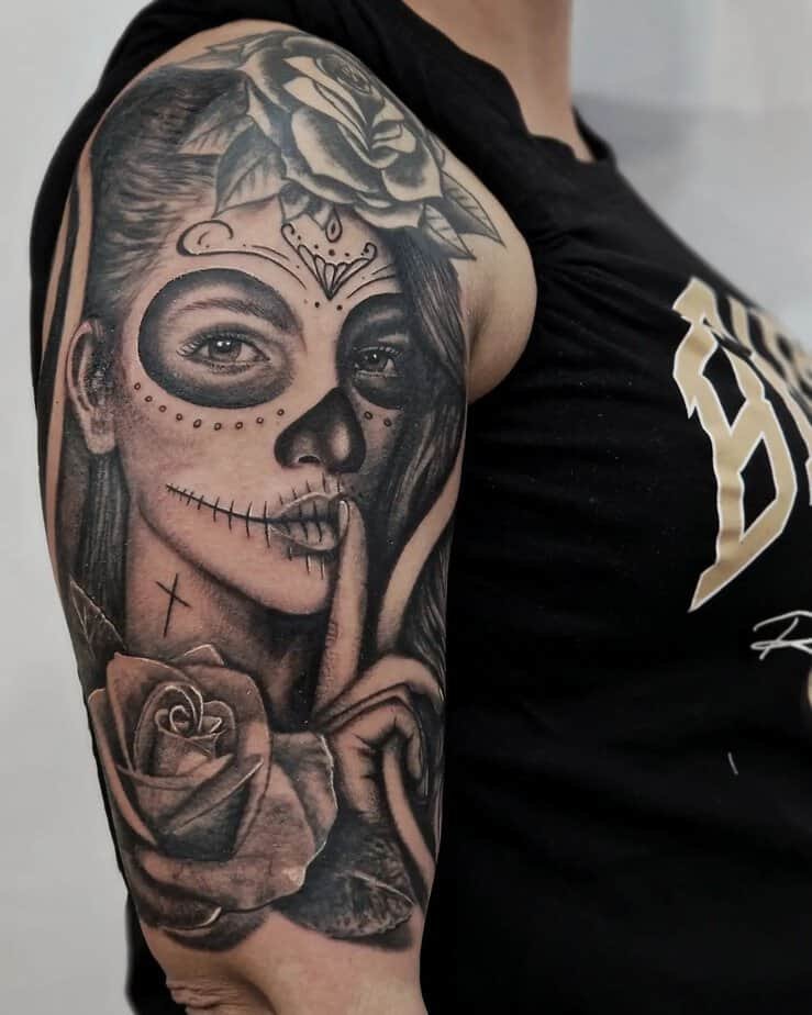 This sugar skull portrait is a gorgeous nod to Día de los Muertos — delicate details, roses, and a face that balances life and remembrance. The finger-over-lips detail adds mystery, making it both respectful and visually striking. It’s a beautiful way to celebrate memory and continuity.