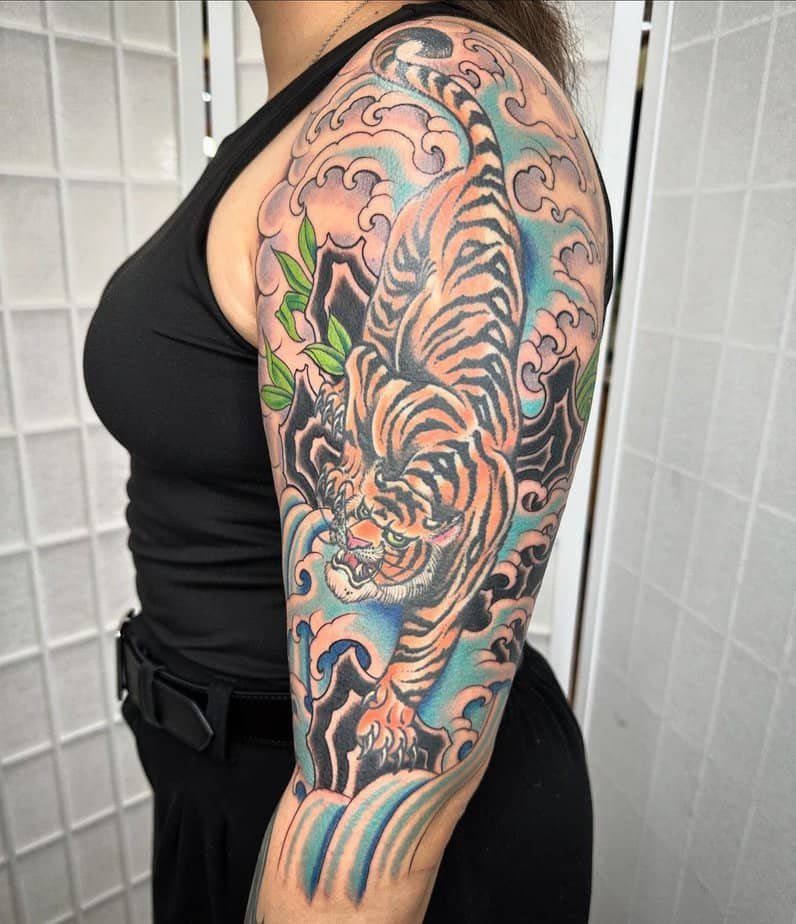 This one is movement and muscle. The tiger’s roar against crashing waves reads as courage and ferocity. Vivid fur colors and the dynamic water make it practically cinematic — ideal if you want your tattoo to feel epic and alive.