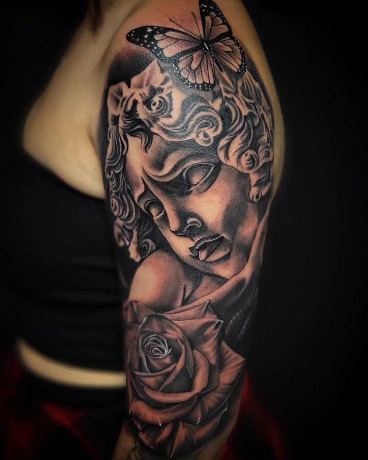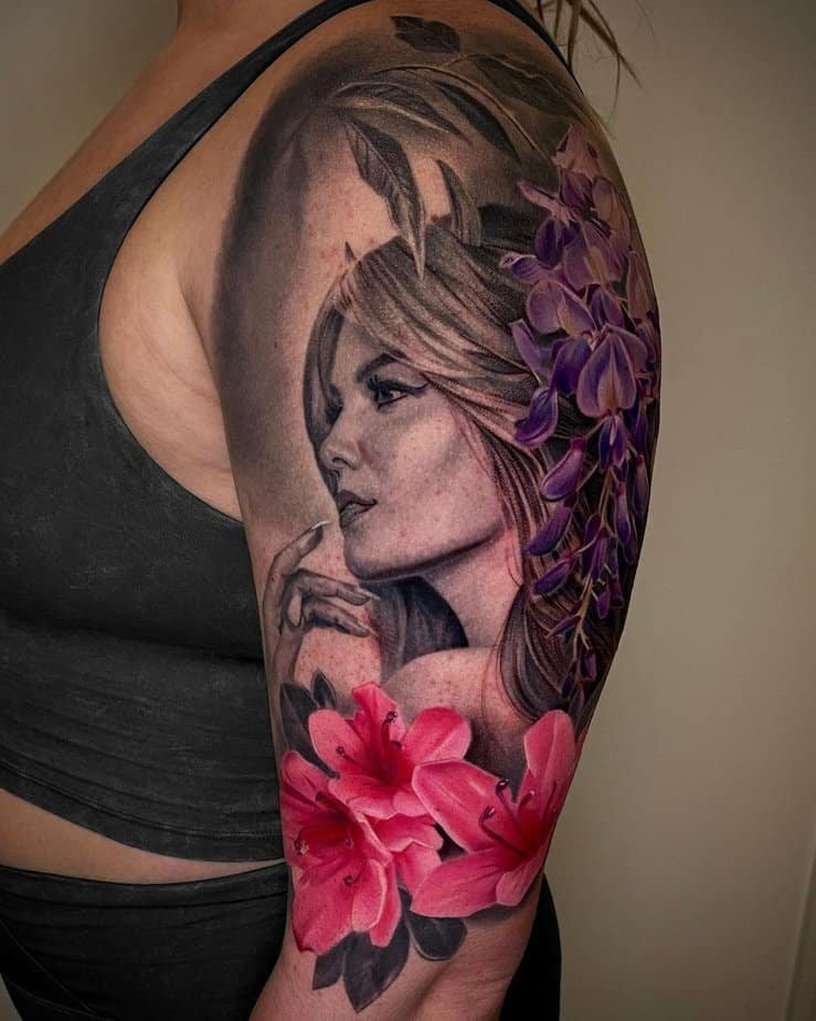 Lilith shows up here as independence and rebellion, rendered with striking realism in black-and-grey and contrasted by vivid pinks and violets. It’s powerful and a little defiant, with flowers that add softness and contrast. For anyone who wants a symbol of feminine strength, this one’s fierce and beautiful.