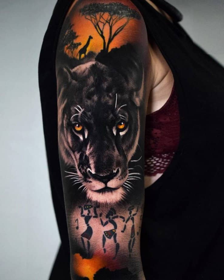 This lioness tattoo hits you with raw power. The amber eyes demand your attention, and the African sunset behind her — complete with giraffe silhouettes and acacia trees — gives the whole piece cinematic energy. It’s regal, protective, and honestly perfect if you want your arm to tell a story about resilience and grace.