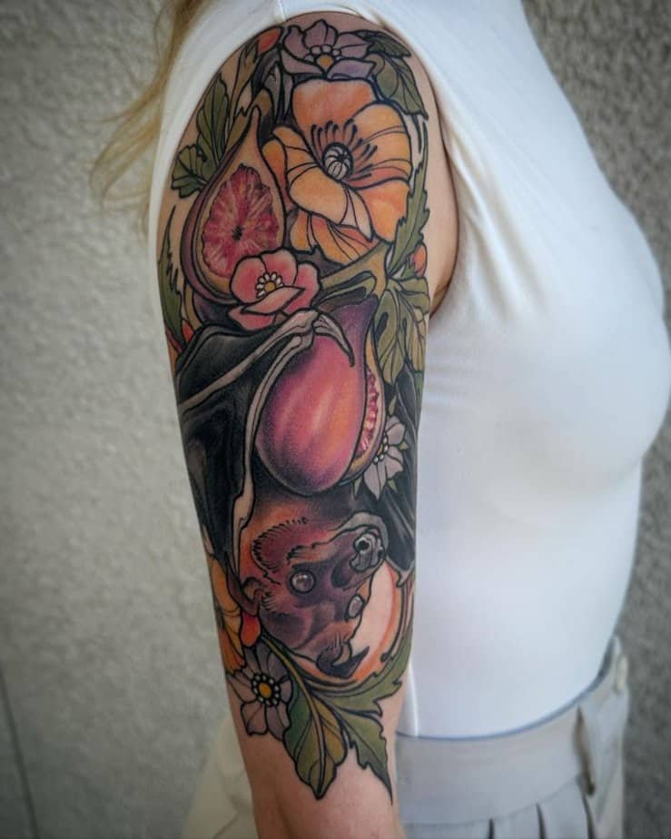 This one’s delightfully unexpected: a bat surrounded by figs and flowers. The colors and natural elements make it whimsical, while the bat brings symbolism of rebirth and the fig hints at abundance and growth. It’s playful, meaningful, and a little offbeat — which I adore.