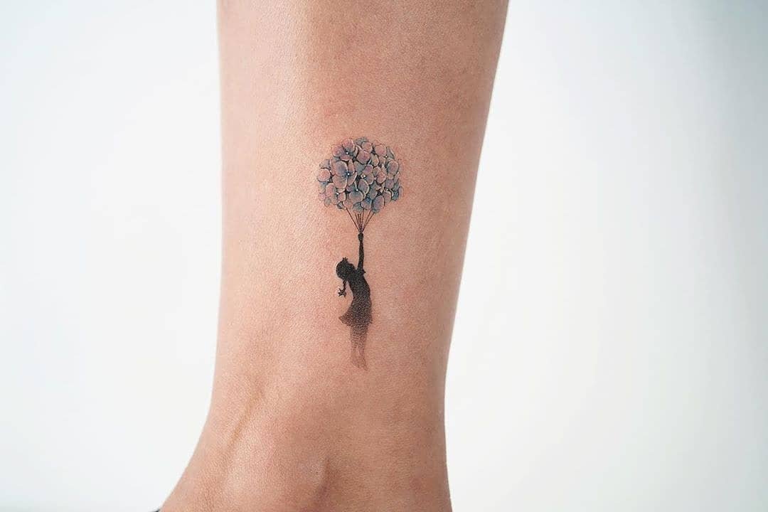 This shin tattoo of a little girl holding a hydrangea balloon is simultaneously whimsical and healing. The blue bloom is hope; the scene feels like your inner child trusting that things will be okay — soft, hopeful, and kind.