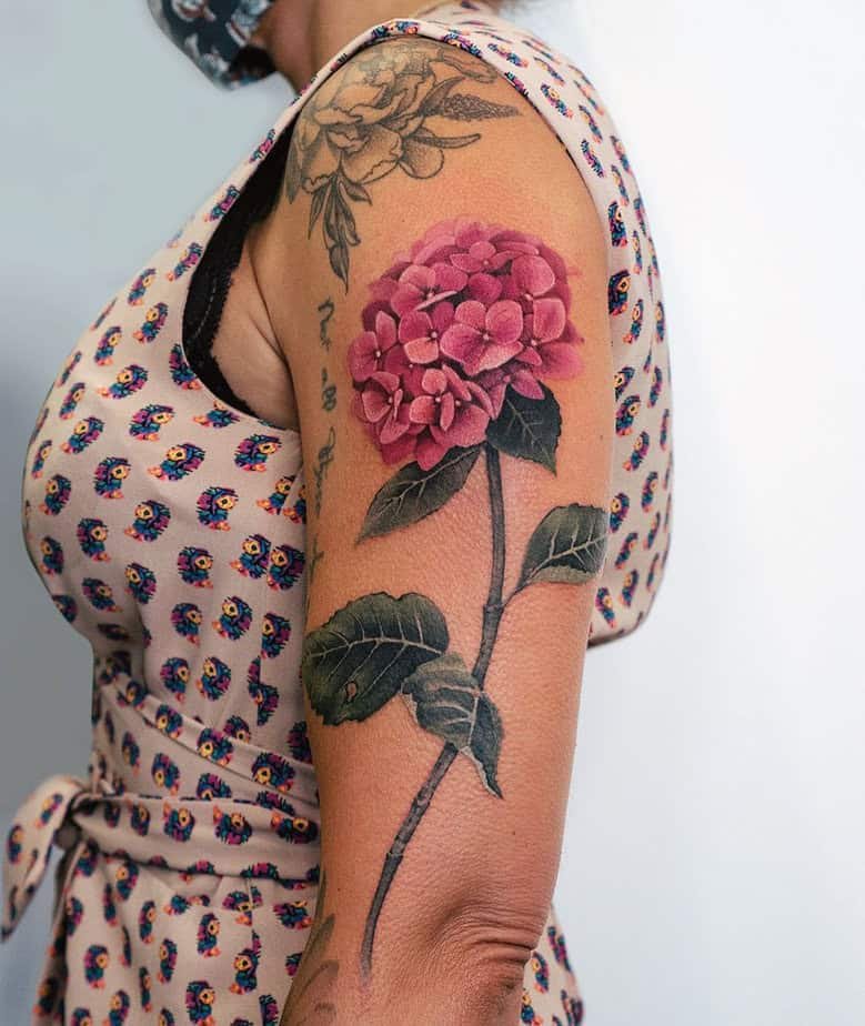 If you want to show love — not just romantic, but for anyone who’s shaped you — pink hydrangeas are perfect. This upper arm piece reads like a small thank-you note to someone who mattered, full of affection and appreciation. It’s tender without being saccharine.