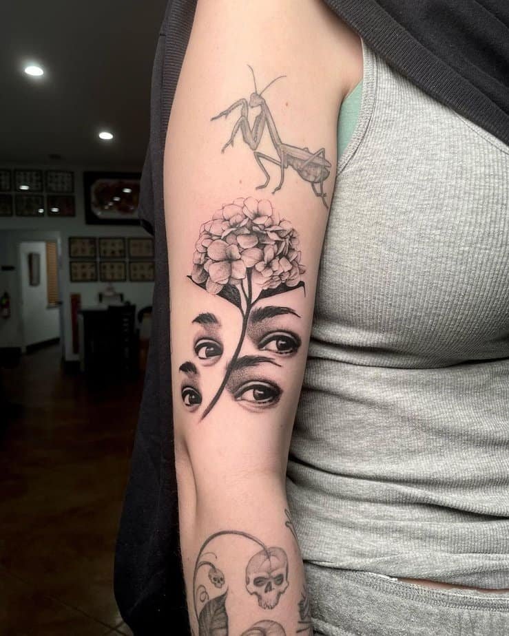 This one blends a hydrangea with pairs of eyes — it’s all about self-awareness and seeing the world clearly. Dotwork and black-and-gray give it a slightly intense, artistic edge that feels like it’s inviting you to look inward.