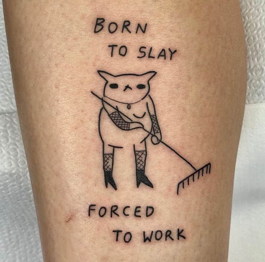 A cat in mesh gloves holding a rake with the words “Born to slay, forced to work” — iconic. It’s a cheeky take on wanting the glam life but still showing up to do the chores. I relate. It pokes fun at our moods while also celebrating that diva spark we all have.