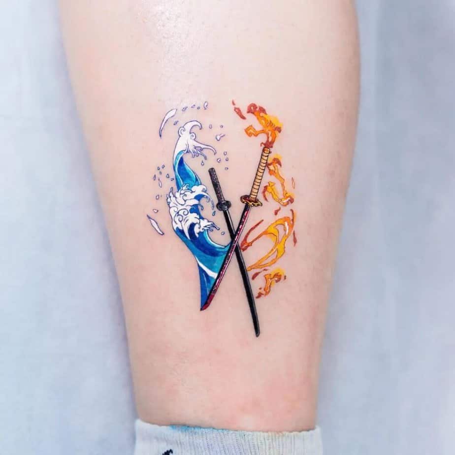 Okay, this one is such a mood. The fire and water contrast is pure poetry — you’ve got chaos and calm facing each other, and the two katanas sitting right between them feel symbolic as hell. It reads like a question on your skin: which path are you taking? The placement here makes it feel intentional, like the weapon itself could swing for both light and dark, depending on who’s wielding it.