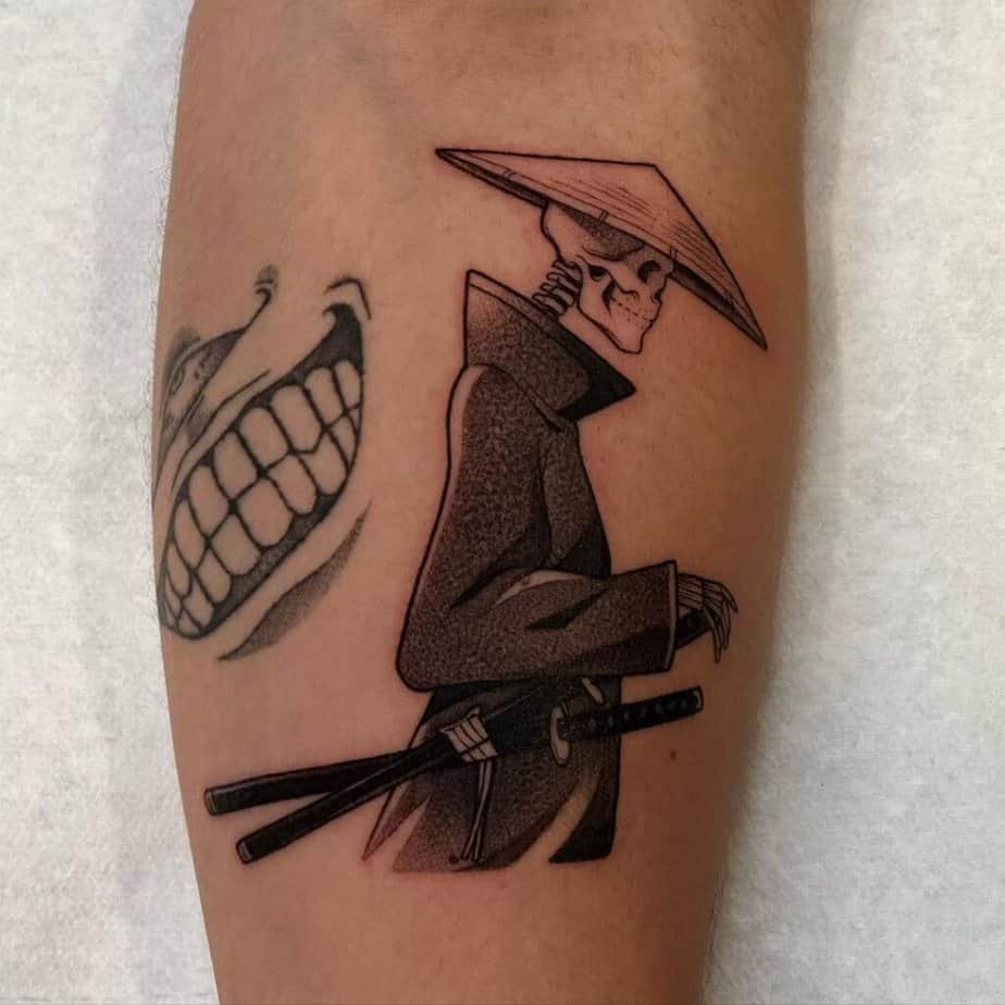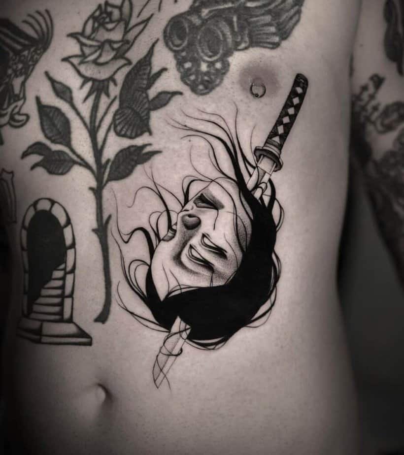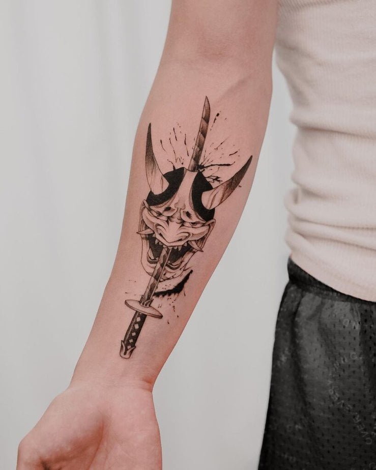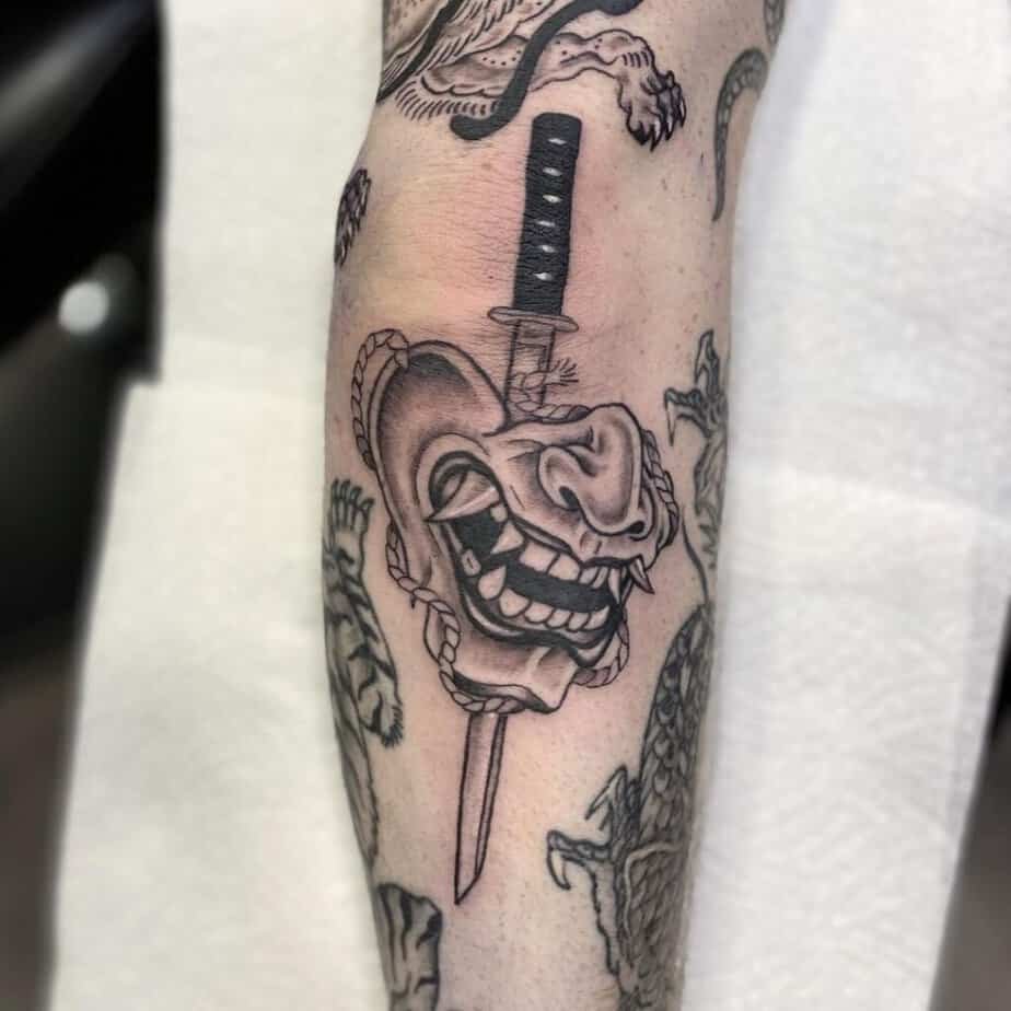 So many katana tattoos pair blades with masks or faces, and this one stands out because the top half of the face is gone while the bottom half laughs wildly around the blade. It’s darkly playful and bold — perfect if you want shock value with artistic intent.