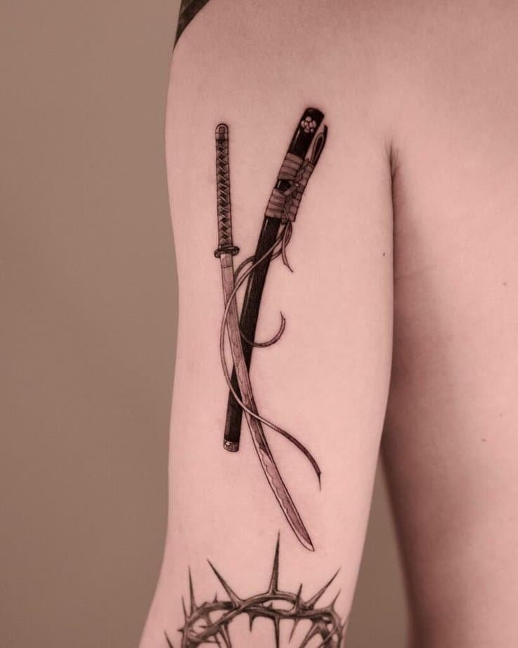 Pairing tattoos across both arms feels deliberate and cohesive, and katanas are shaped so perfectly for that. There’s room for ornaments, moons, eyes — little extras that make the set feel curated rather than matched. It’s a confident energy.