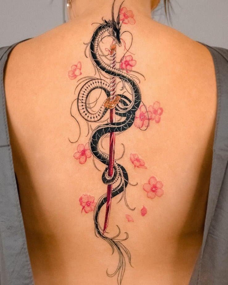 This sprawling back tattoo packs in the classics: a katana, a dragon, cherry blossoms — all woven together with deep shading, precise linework, and pops of color. It’s the kind of piece that reads like an ode to Japanese culture, done with real craftsmanship. If you want to go big and honor tradition with flair, this is a masterpiece.