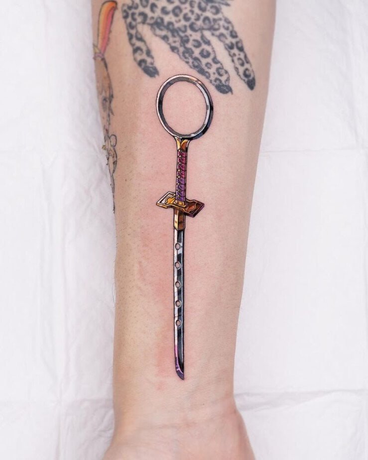 If you’re into vivid color, this one feels like a tiny painting on skin. The reds and yellows pop so hard that the katana almost feels alive — like it could catch the light in real life. Color tattoos like this are dramatic in a different way from blackwork: they’re bold, joyful, and unapologetically loud.