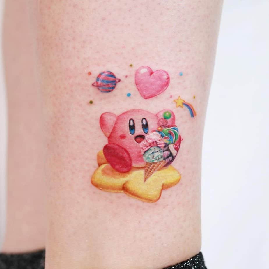 This leg tattoo captures Kirby on his Ride Star surrounded by planets, hearts, and rainbows — it’s basically an explosion of happiness. The cartoon style and floating elements make it feel bright and lively, a joyful celebration of the character’s sweetest traits.