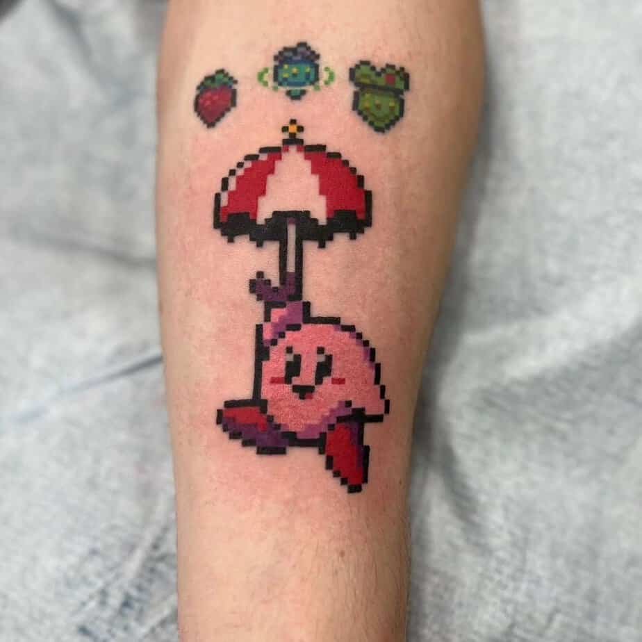 Kirby’s Parasol ability gets a colorful moment here, and honestly, the umbrella just elevates his charm. It’s practical in the games and beautiful as a tattoo — the bright umbrella colors play nicely with Kirby’s look. It feels whimsical and a little heroic at the same time.
