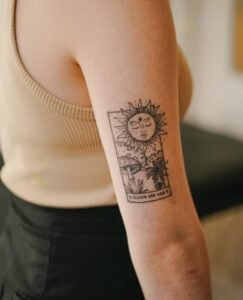 Done in soft watercolour-y pastels, this shoulder piece feels like a breeze. The blues and pale yellows blend like a tiny fairy-tale bouquet, larkspur and lily-of-the-valley dancing together. If you’re after something feminine, ethereal, and quietly magical, this is the sort of tattoo that makes you smile every time you catch a glimpse.