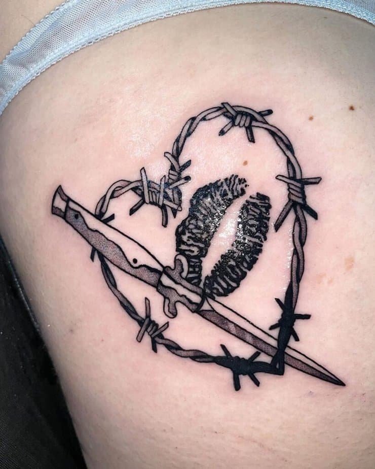 A dagger and barbed wire paired with lips? That’s symbolism for guarding what you love — or keeping your heart safe. It’s edgy, dramatic, and honestly kind of poetic.