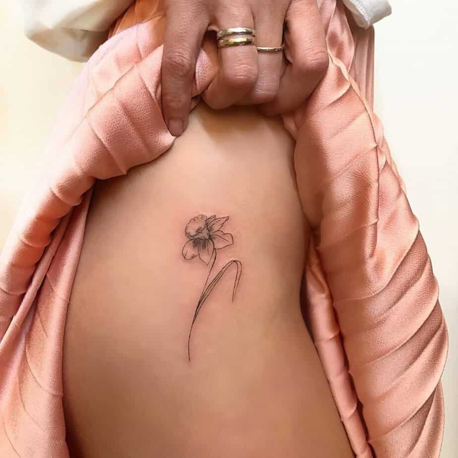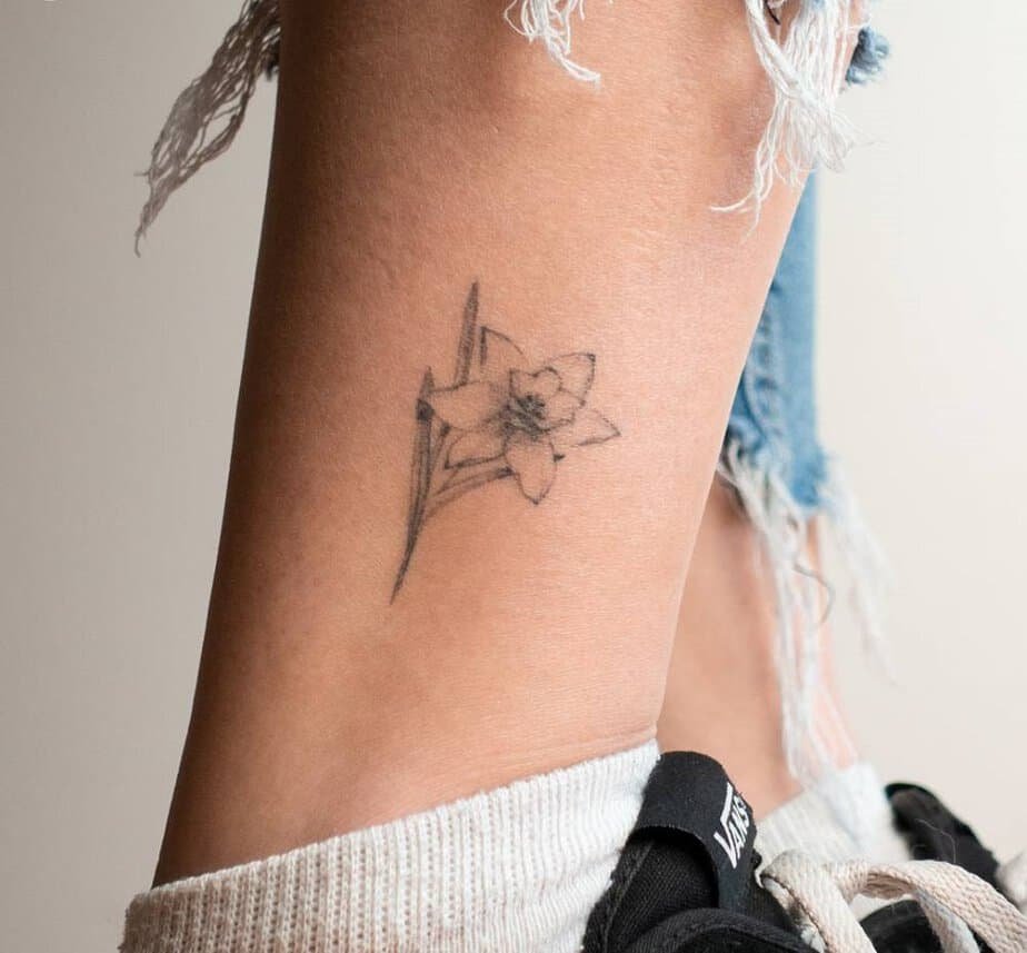 Ankle tattoos always feel effortlessly cool, and this minimalist daffodil is no exception. It’s modern, fresh, and pairs with whatever shoes or mood you’re in.