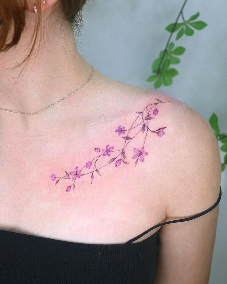 A vine draped across the collarbone is so graceful. The tiny purple blossoms look like they’re growing right out of the skin — subtle and enchanting. It’s a placement that feels personal but also shows off beautifully with an off-the-shoulder top. Understated but memorable.