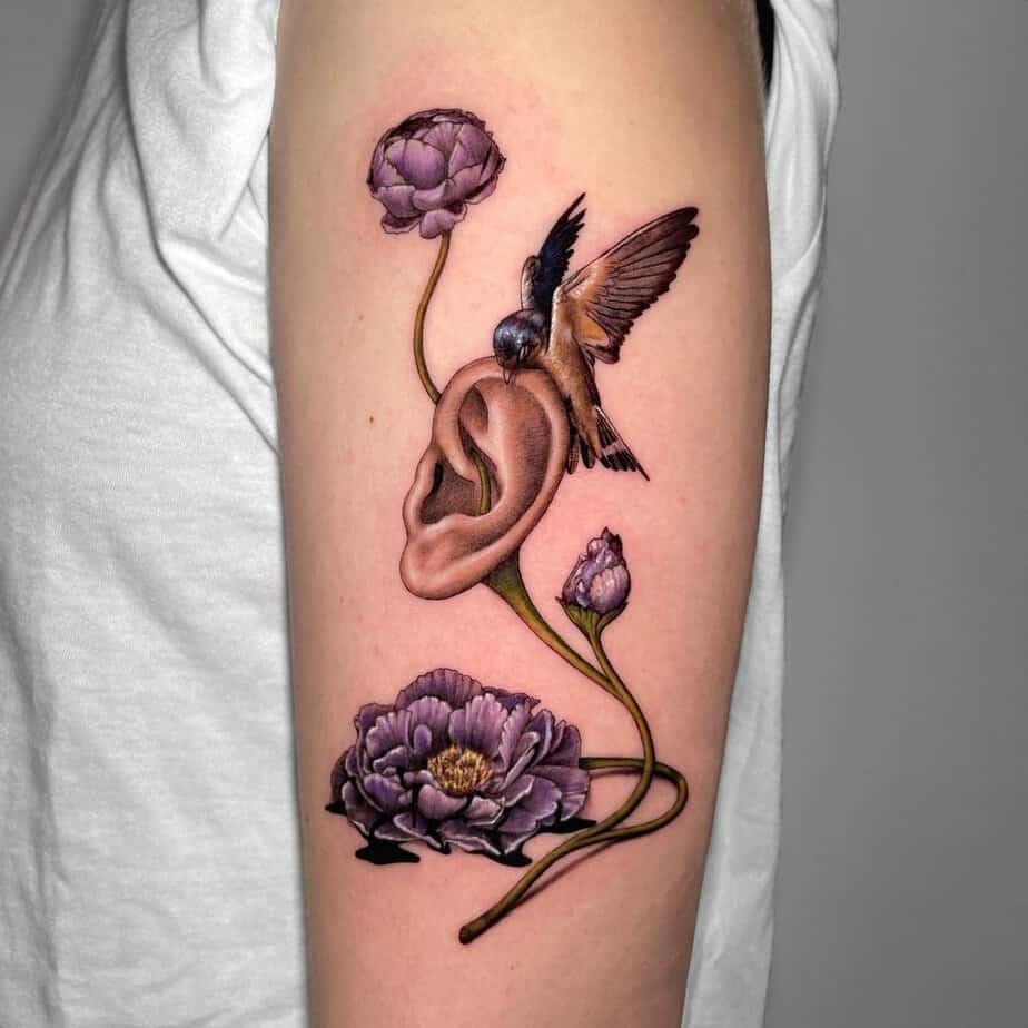 This one’s delightfully strange — a purple peony paired with a sparrow and a human ear. It feels like surrealist art on skin: lush petals, realistic bird details, and then that ear that makes people pause and ask questions. If you want a conversation starter that’s also beautiful, this is it.