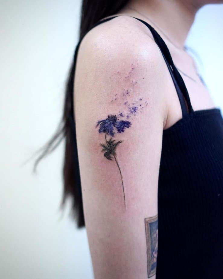 If you love loose brushstrokes and painterly vibes, an abstract watercolor flower across the shoulder looks like a canvas come to life. Flowing purples blend and fade in a way that feels spontaneous and free — perfect for someone who wants art that breathes.