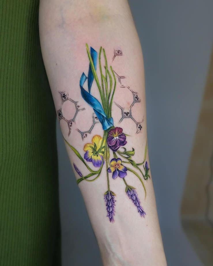 This one’s basically a mini garden for your arm — purple pansies, sprigs of lavender, and a sweet ribbon tying it all together. The linework is delicate, the shading gives each bloom its own little personality, and the ribbon pulls the whole scene into something playful and romantic. If you can’t pick a favorite flower, this is your compromise: a little of everything, and each bit sings.