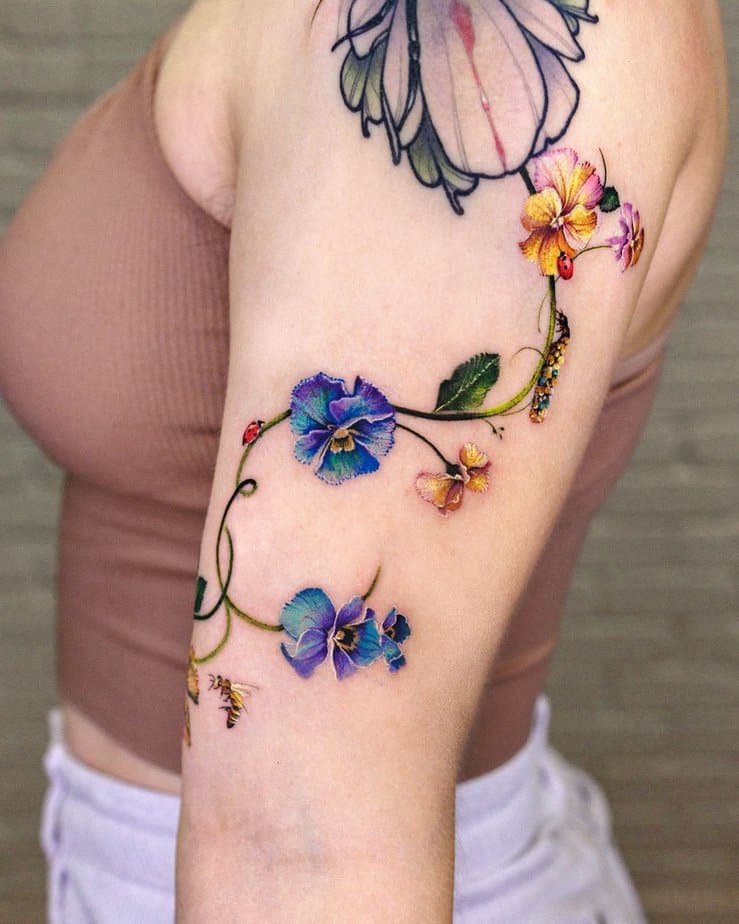 Imagine pansies in purple and blue, winding up your arm like they’re growing there. The petals feel almost alive with tiny details, and the garland has this whimsical, nostalgic vibe. Pansies mean thoughtfulness and remembrance, and when you add the sweet little ladybug, bee, and caterpillar details, it becomes this tiny, living scene — cute and meaningful in the very best way.