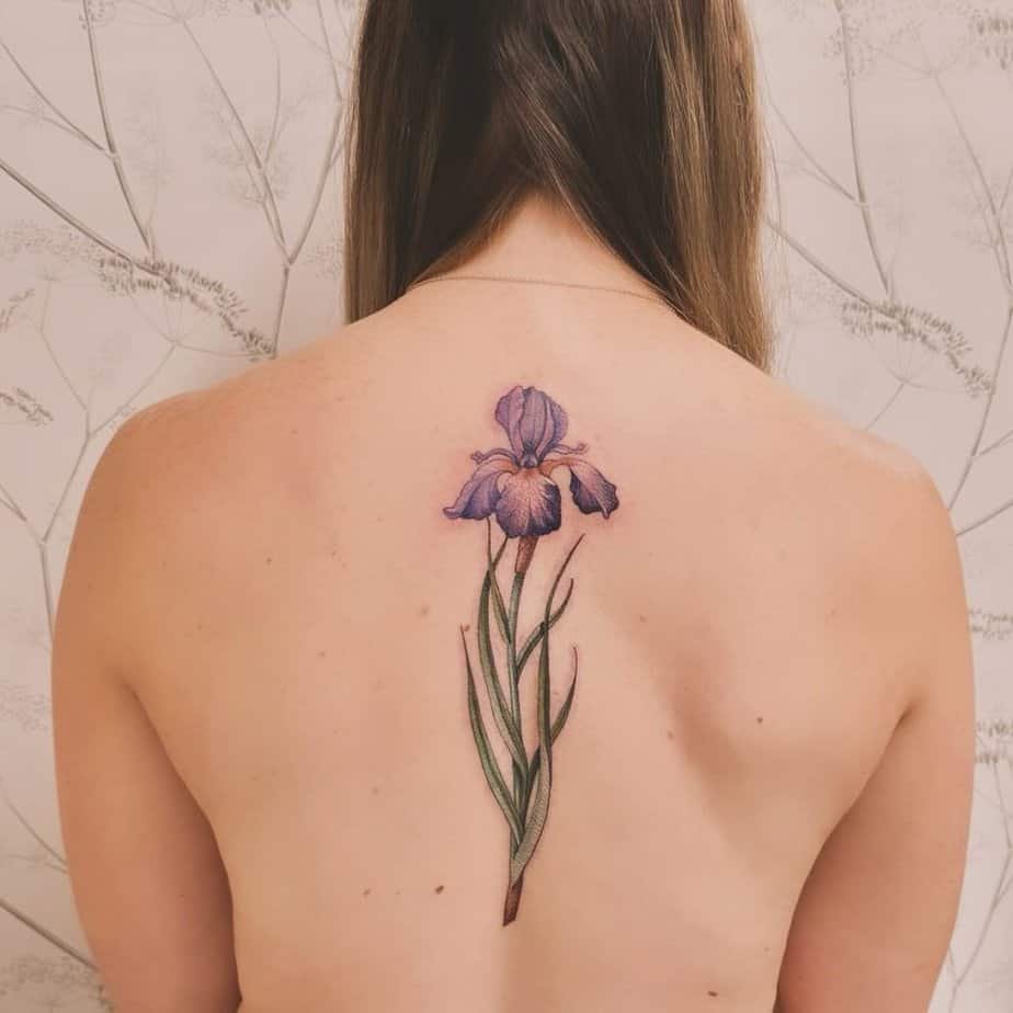 A gentle iris tracing the back feels refined and quietly beautiful. The elongated stem and soft purple petals look like they’re naturally growing there, and the iris is a classic symbol of wisdom and hope. If you want sophistication with a tender edge, this could be your match.