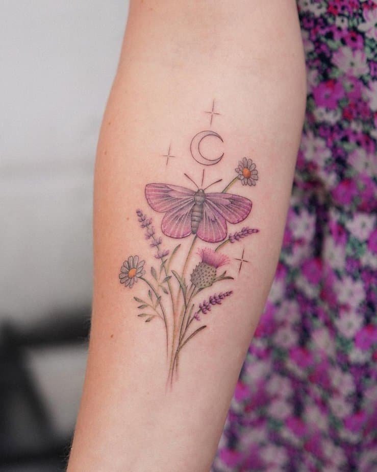Lavender, a soft purple moth, stars and a crescent moon — yes please. This bouquet gives off a dreamy, slightly witchy vibe that’s equal parts serene and mysterious. The lavender calms, the moth and moon invite curiosity, and together they create a tattoo that feels like a little charm for the soul.