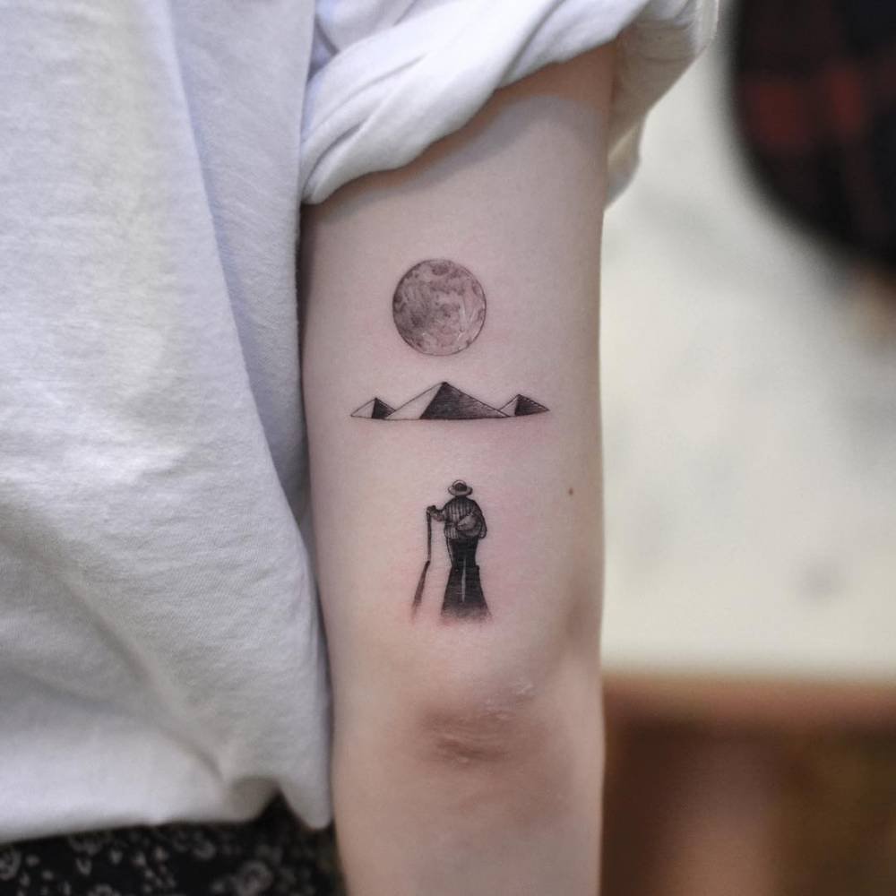I adore the vibe of this one — a little person standing beneath a full moon, staring at the pyramids. It’s minimal but somehow huge in feeling: a reminder to wander, to be curious, and to sit with life’s mysteries. Perfect for someone who likes a quiet, poetic piece rather than something that shouts.
