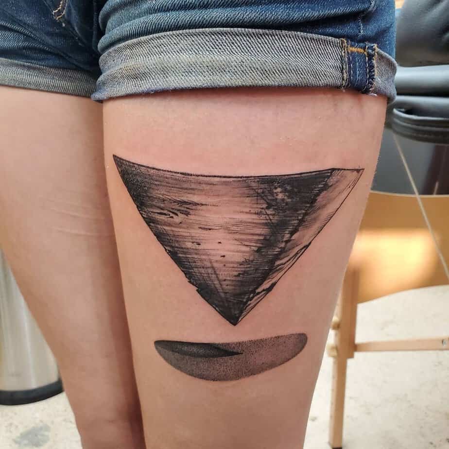 Clean lines, artistic abstraction, and a curved shadow that makes the inverted pyramid look like it’s hovering — this thigh piece is really modern. It’s the kind of design that makes people stop and think because it’s familiar yet turned on its head.