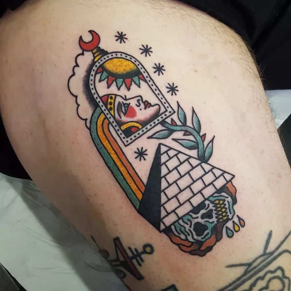 If you’re here for old-school tattoo energy, this one’s for you. Bold lines, bright colors, and a vintage portrait combined with the pyramid — it’s nostalgic and joyful. A fun choice if you want personality and a nod to tradition.