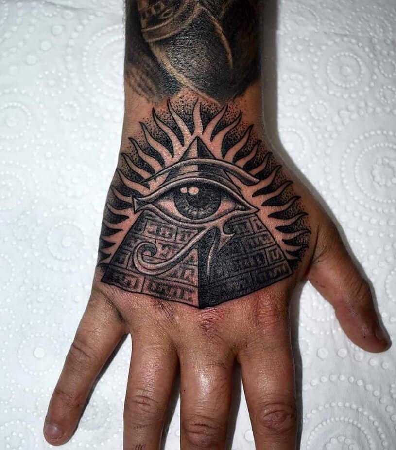 An Illuminati-style hand tattoo that commands attention