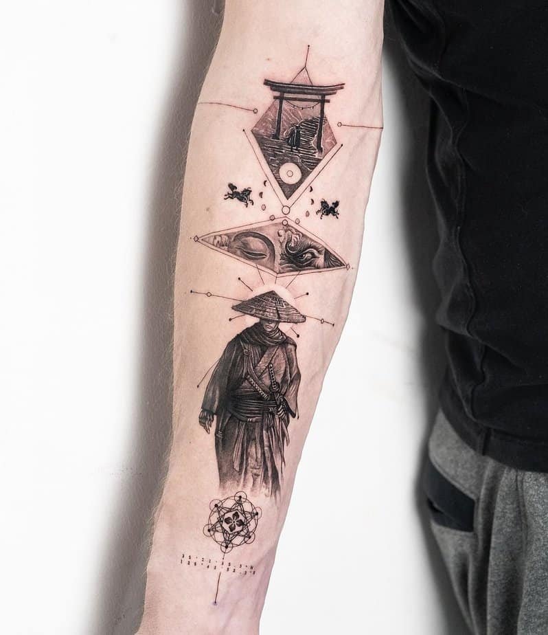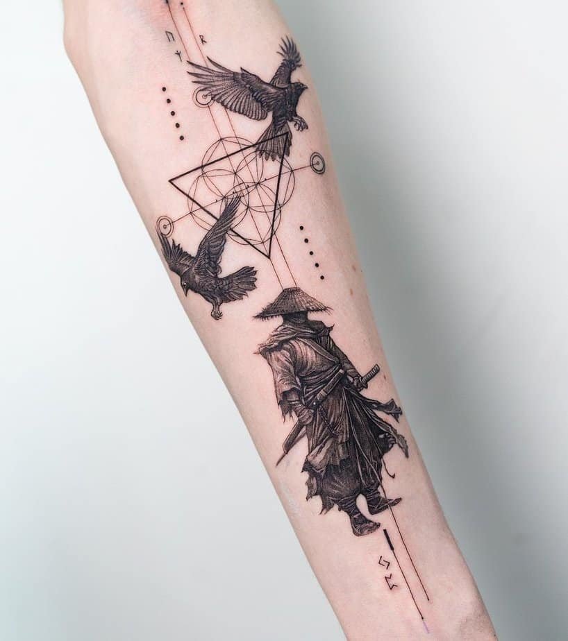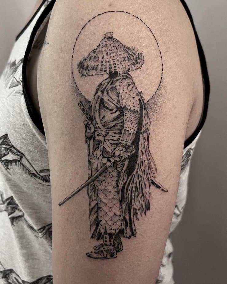 Dotwork brings a meditative vibe. This version wraps a circle around the ronin’s head like a protective halo, a nod to focus and a deeper understanding earned through trials. It’s minimalist but meaningful — that kind of piece that feels like a talisman.