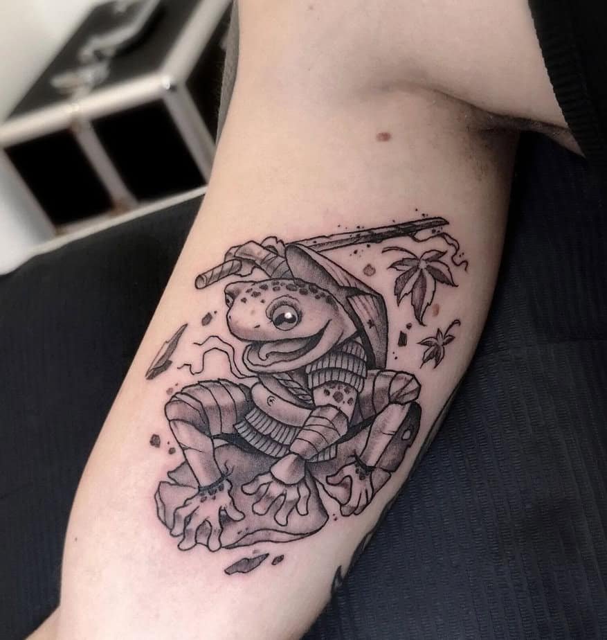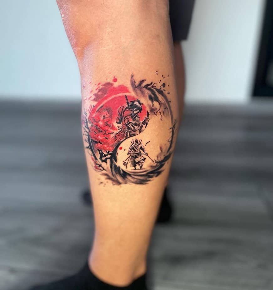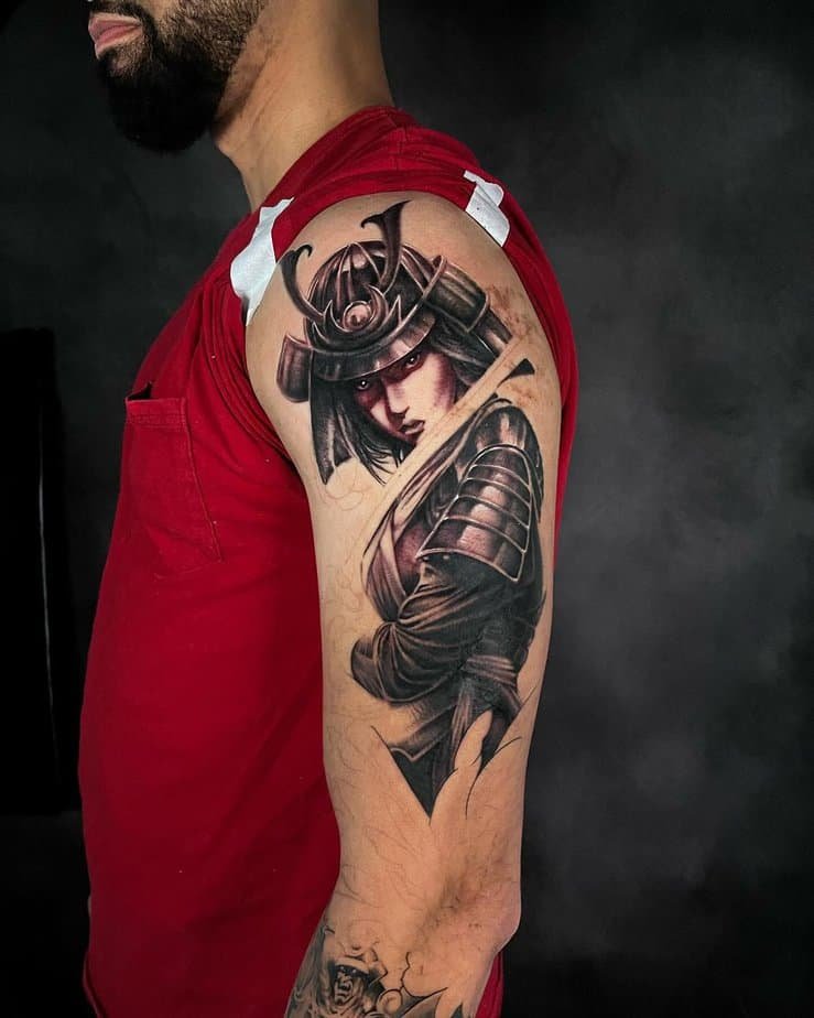 Sometimes you don’t need the whole figure — just the face. This design captures a ronin mid-scream, white eyes, a look that says he’s always ready for what comes next. It’s visceral and raw, all focus and fire. If you want a tattoo that feels like a gut-level truth about resilience, this is it.