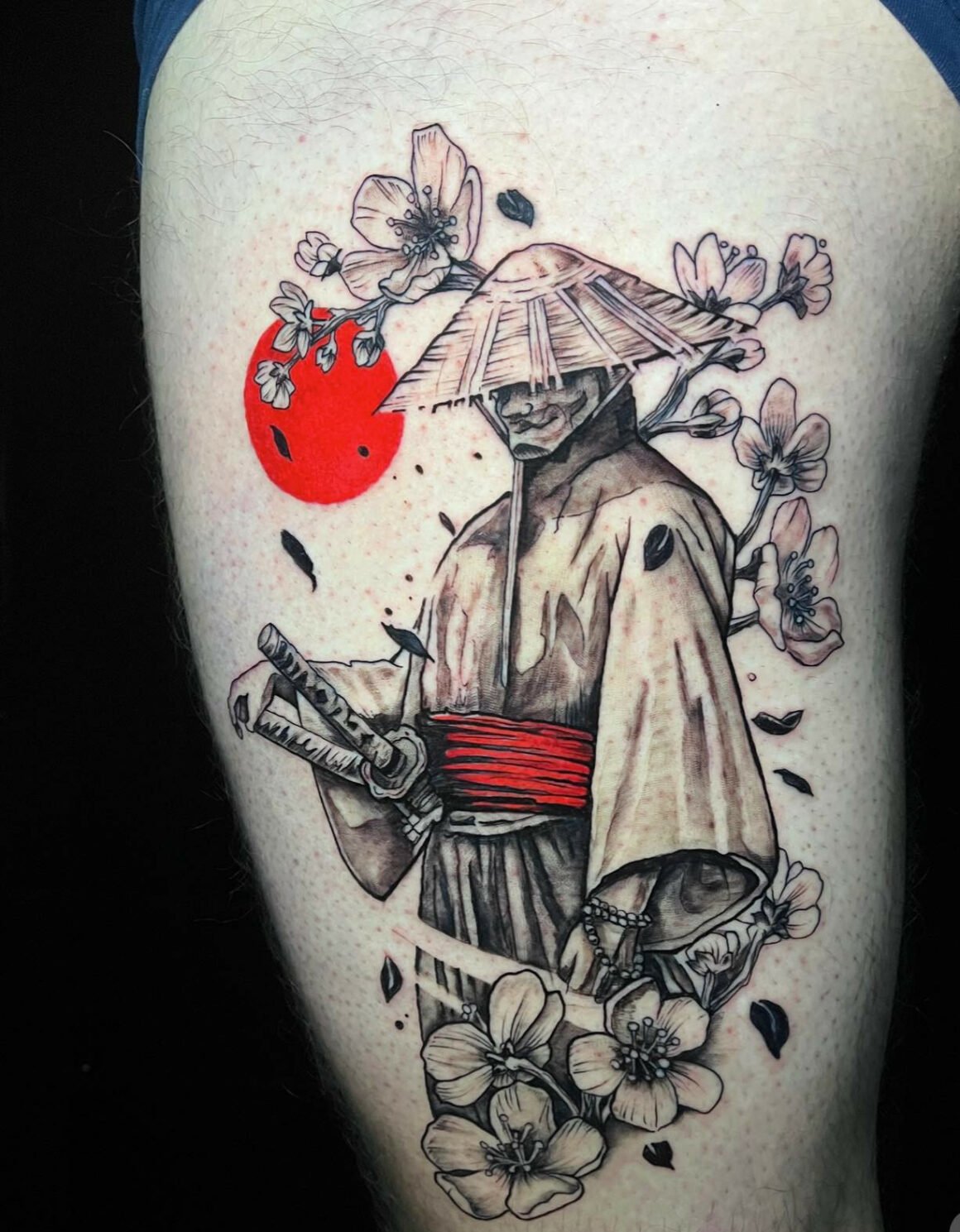 Here’s a favorite combo: heavy blackwork to show the ronin’s solitude and strength, with a single cherry blossom or color accent to remind you that hope exists. The dark aura reads like endurance; the blossom is that soft promise that brighter days come. It’s dramatic without feeling melodramatic.