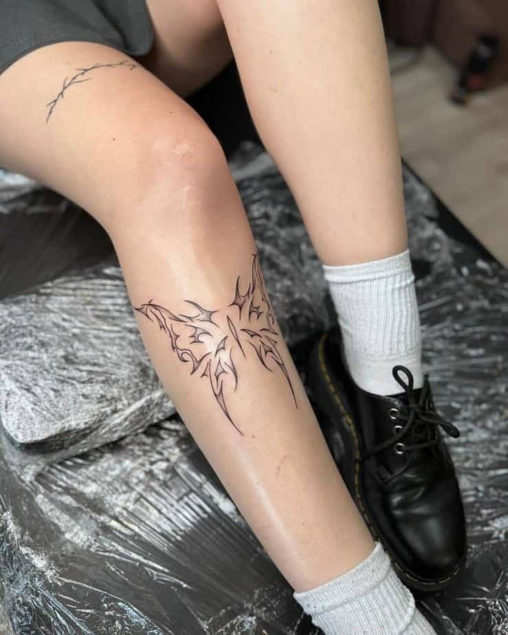 Blackwork has this heavy, confident presence. A butterfly in solid blacklines feels dramatic and timeless, and pairing it with other blackwork elements across both shins? Chef’s kiss.
