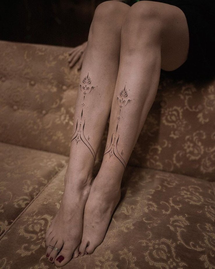 Ornamental tattoos don’t have to be tiny to feel delicate. On the shin, they can be larger yet keep that light, decorative aesthetic — perfect if you want subtlety with scale.