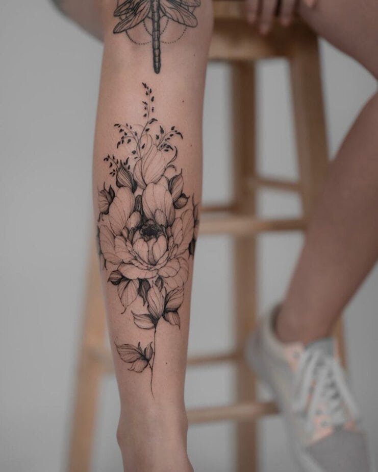 Peonies are lush, romantic, and feel a little fancy. If flowers are your thing, a peony on the shin gives you drama without being loud.