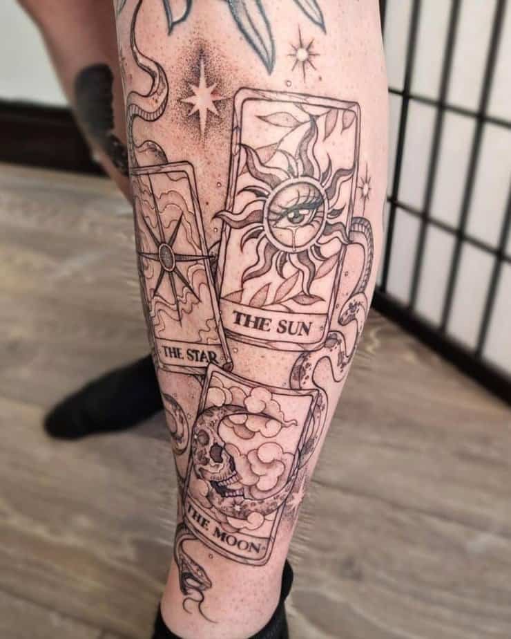 Tarot tattoos are like wearing your personal mythology. Pick cards that represent chapters of your life and let the artist create a scene that reads like a little biography.