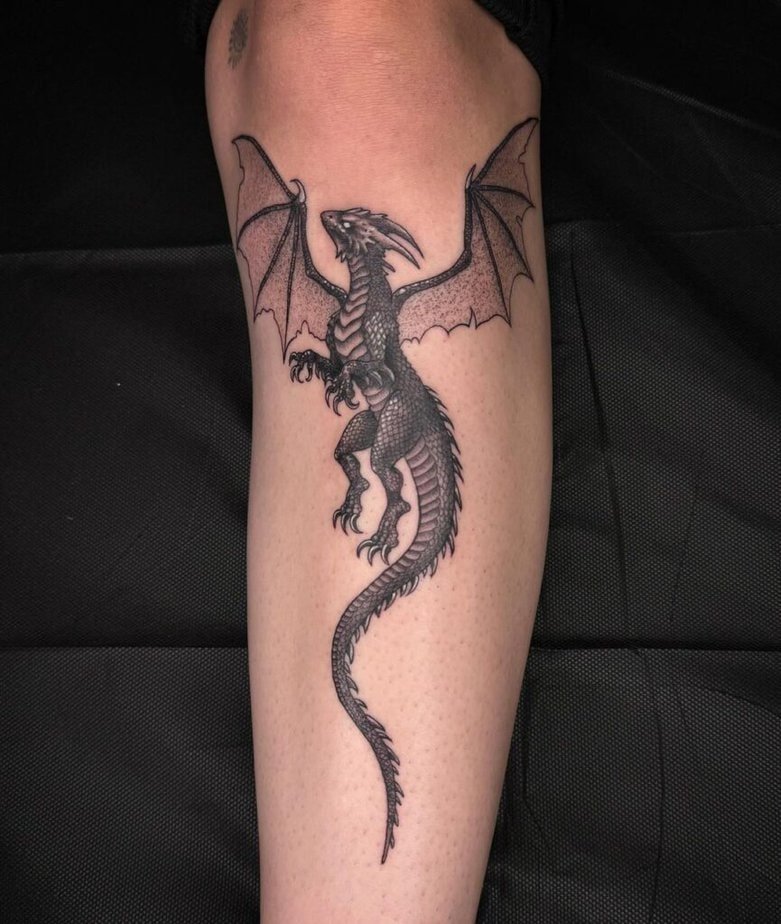 Dragons are dramatic in the best way. A finely detailed blackwork dragon snaking down the shin is classic fantasy energy — powerful, protective, and totally boss.