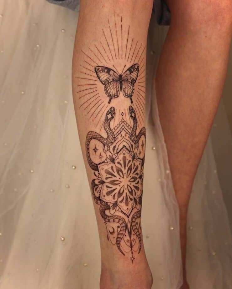 Combining elements makes the piece feel personal: maybe a snake for transformation, a butterfly for freedom, and ornaments to tie it together. It’s a mini narrative wrapped around your leg.