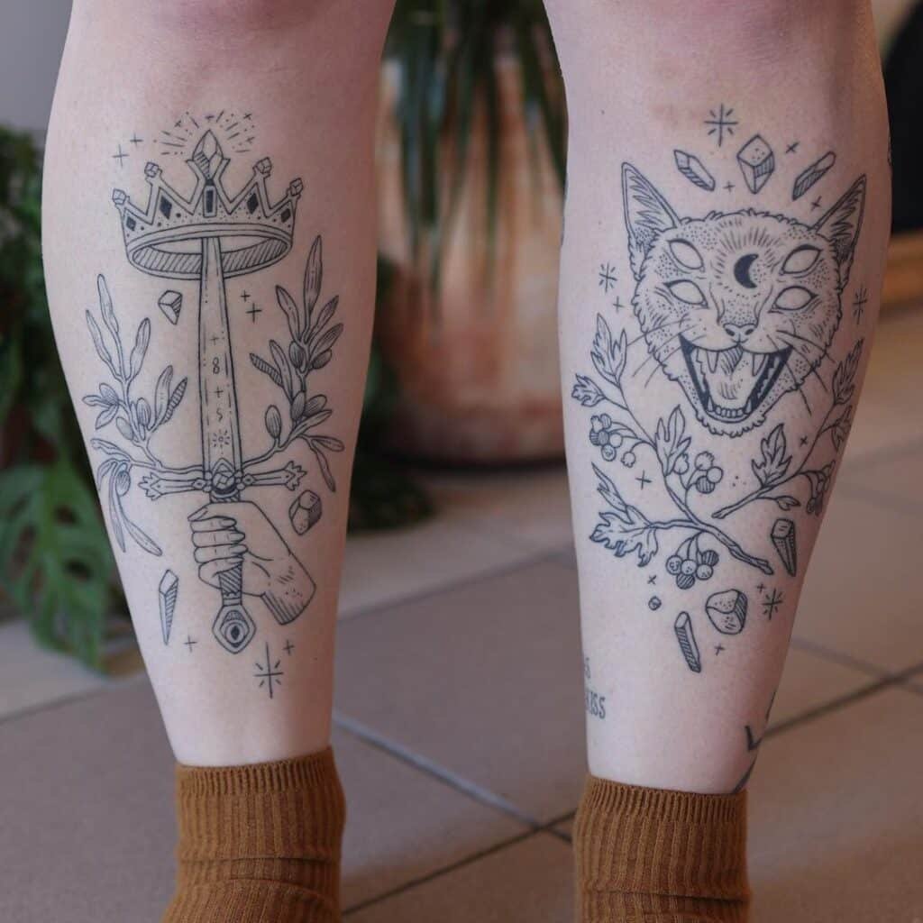 Cats, daggers, crystals, olive branches — sometimes the most chaotic combos are the most charming. If you’ve got a bunch of symbols you love, the shin is a great place to let them coexist.