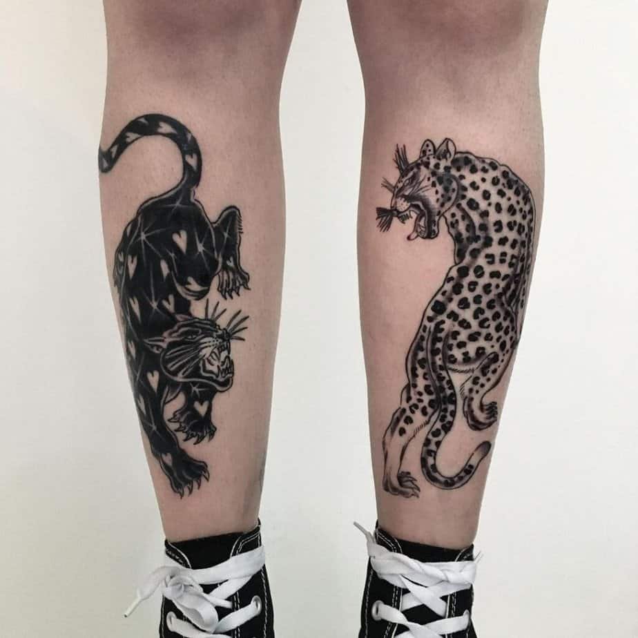 Want to go all in? Split a powerful scene across both shins — a panther on one, a leopard on the other. Together they speak strength, freedom, and fierce confidence.