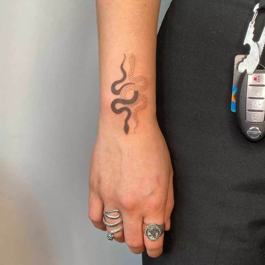 You’d never guess this was hand-poked at first glance. It’s right between minimal and detailed: symmetrical, clean, and quietly striking. If you want something with a bit of presence without shouting, this is it.